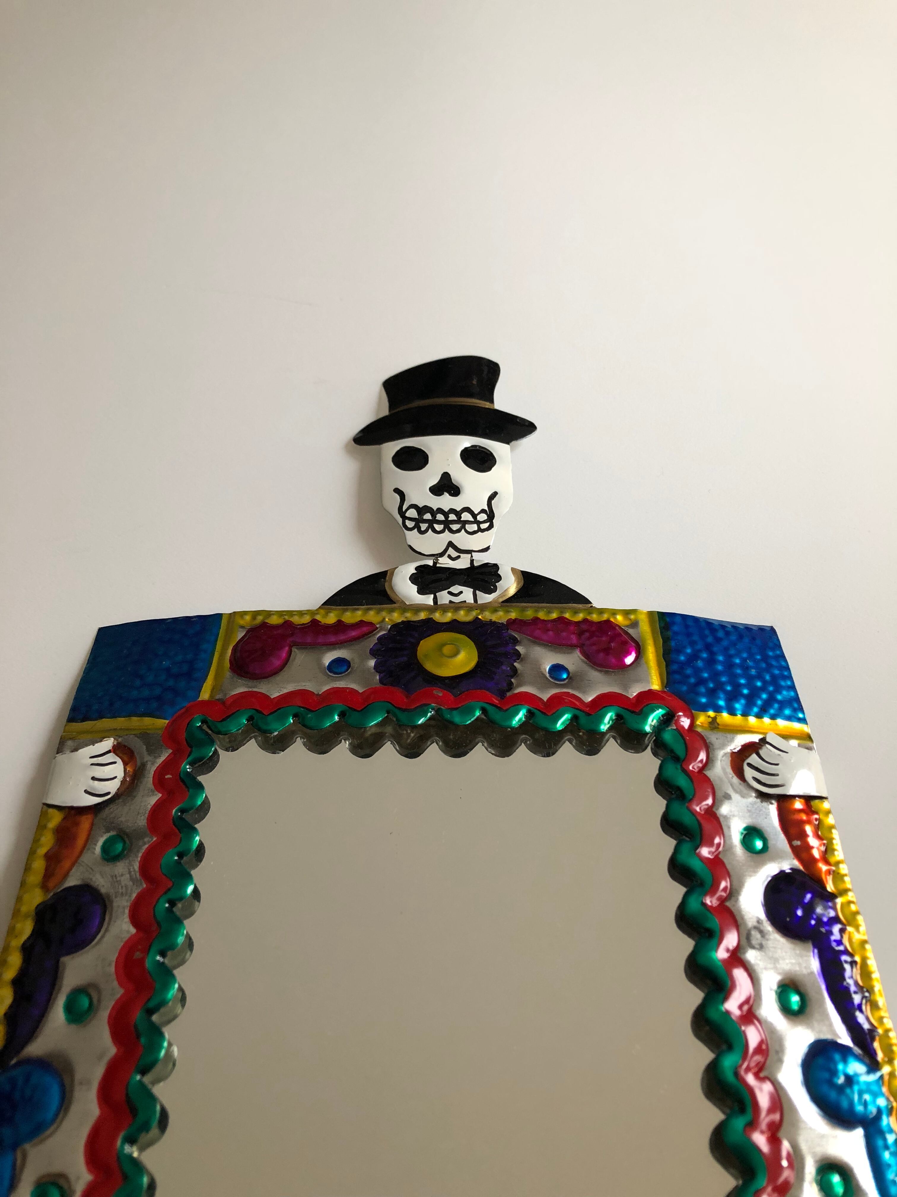 タキシードでおめかししたドクロがミラーを支えてくれてるとこが特徴的で、お化粧とかポップで可愛いデスク周りにいかがでしょうか。